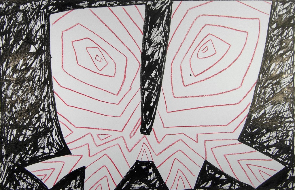 Eve Picher, Mythix46 (Strix), acrylic marker, pencil, Chinese ink, 12×18 inches, 2026