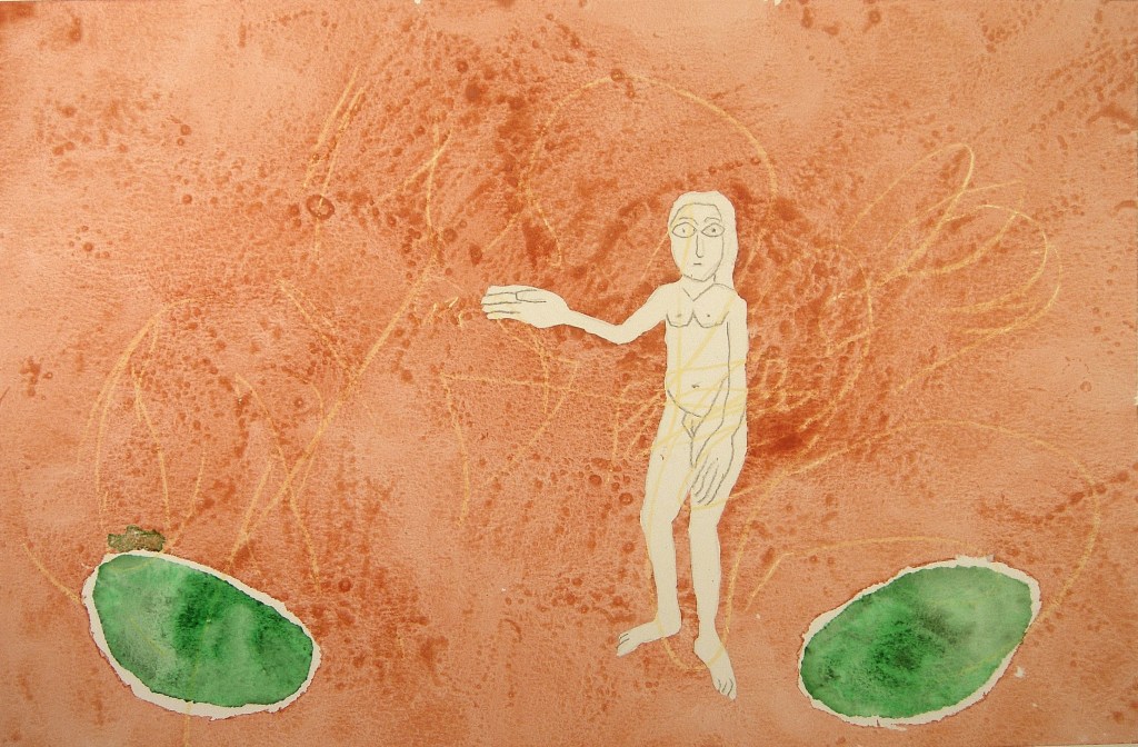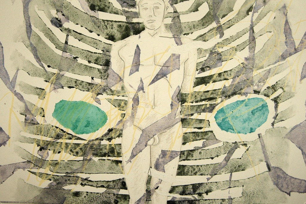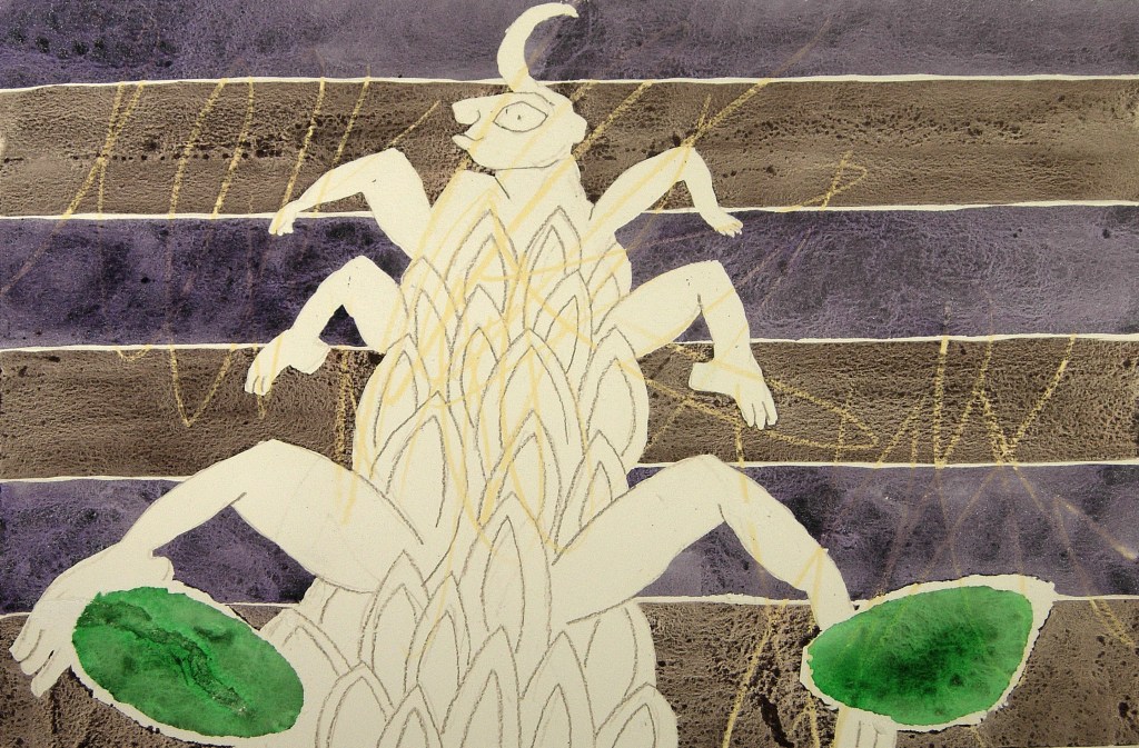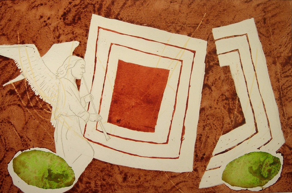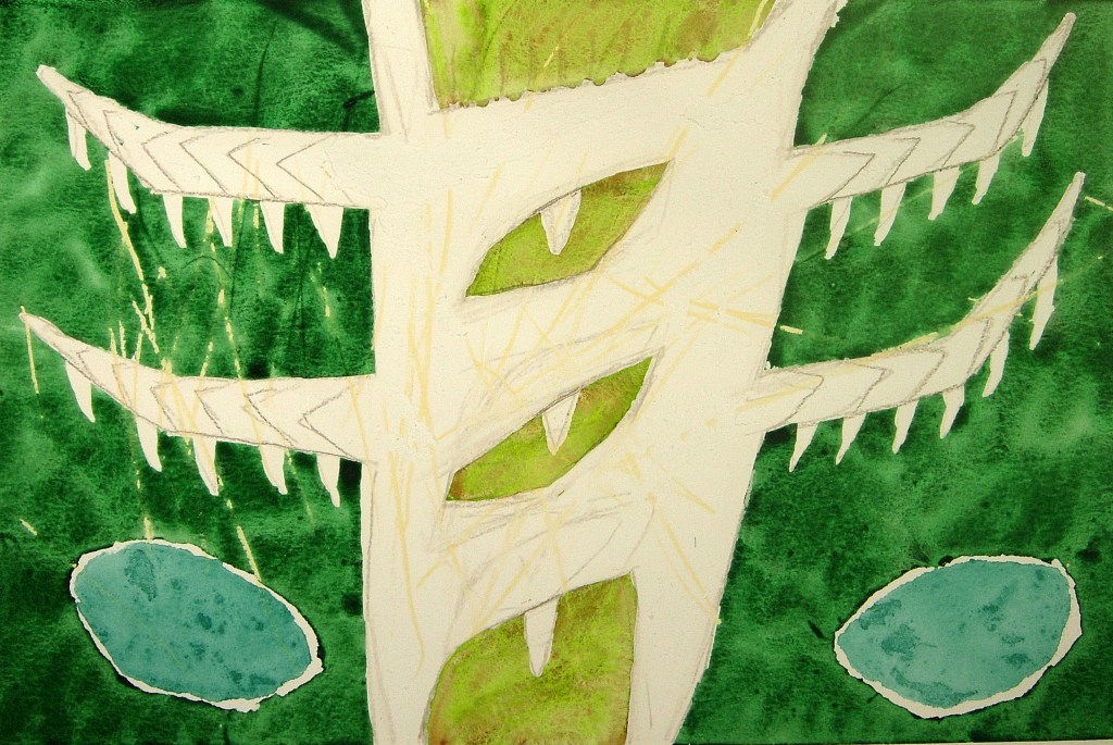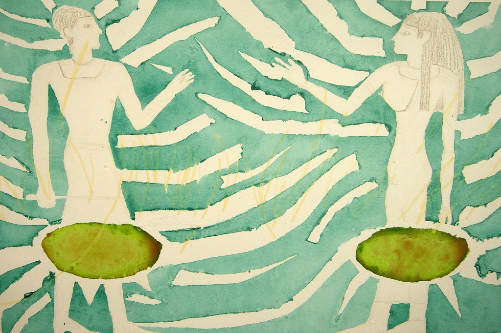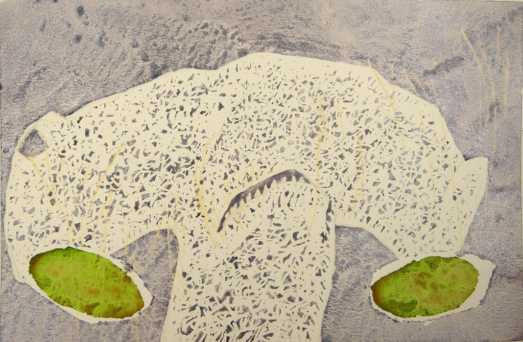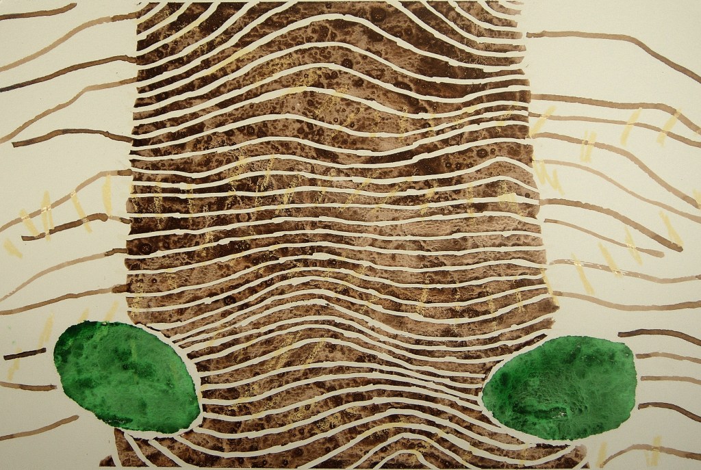 Eve Pix, O-Verts120, pipestone, Russian emerald, and pencil on paper, 12×18 inches, 2025