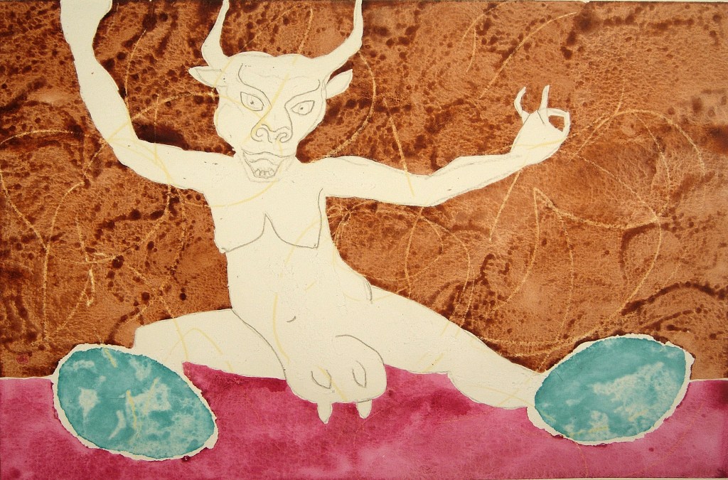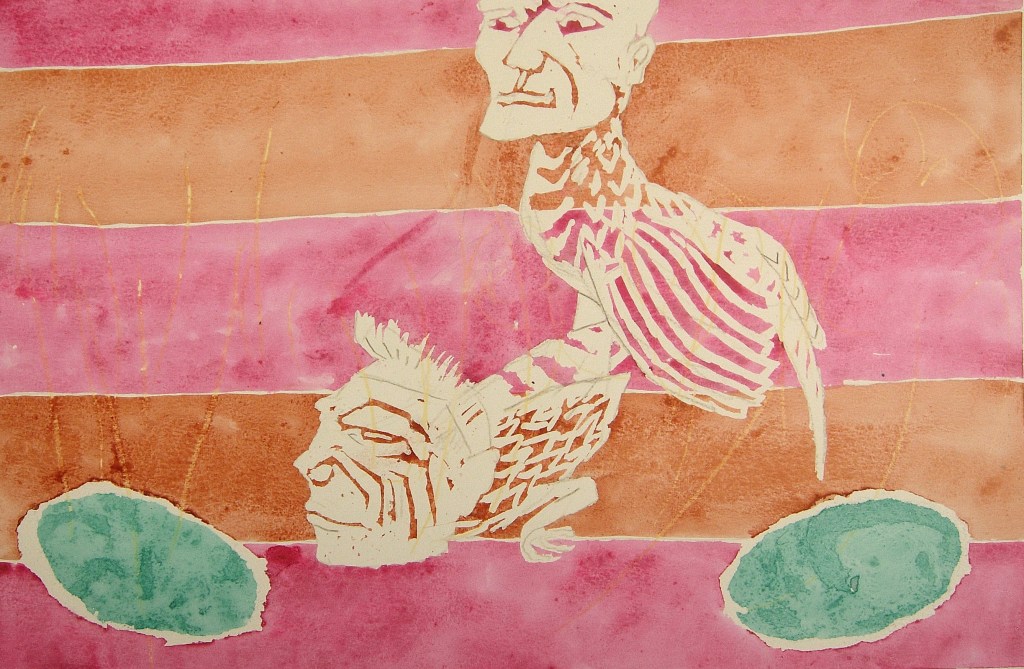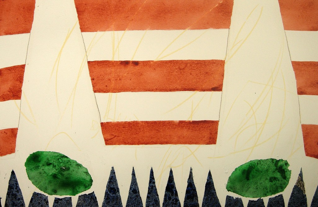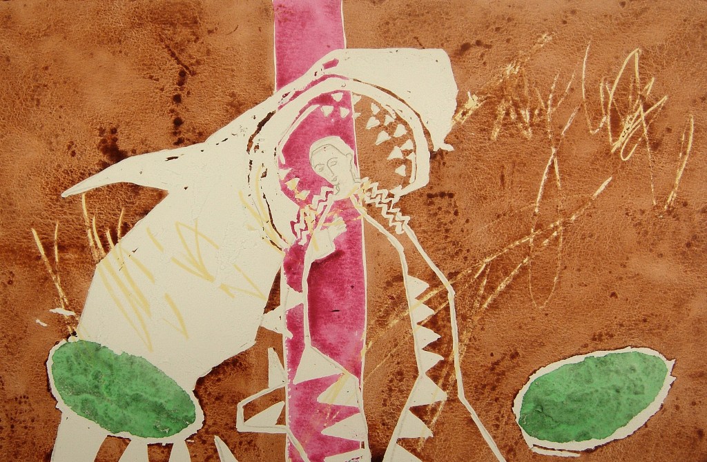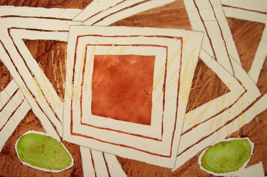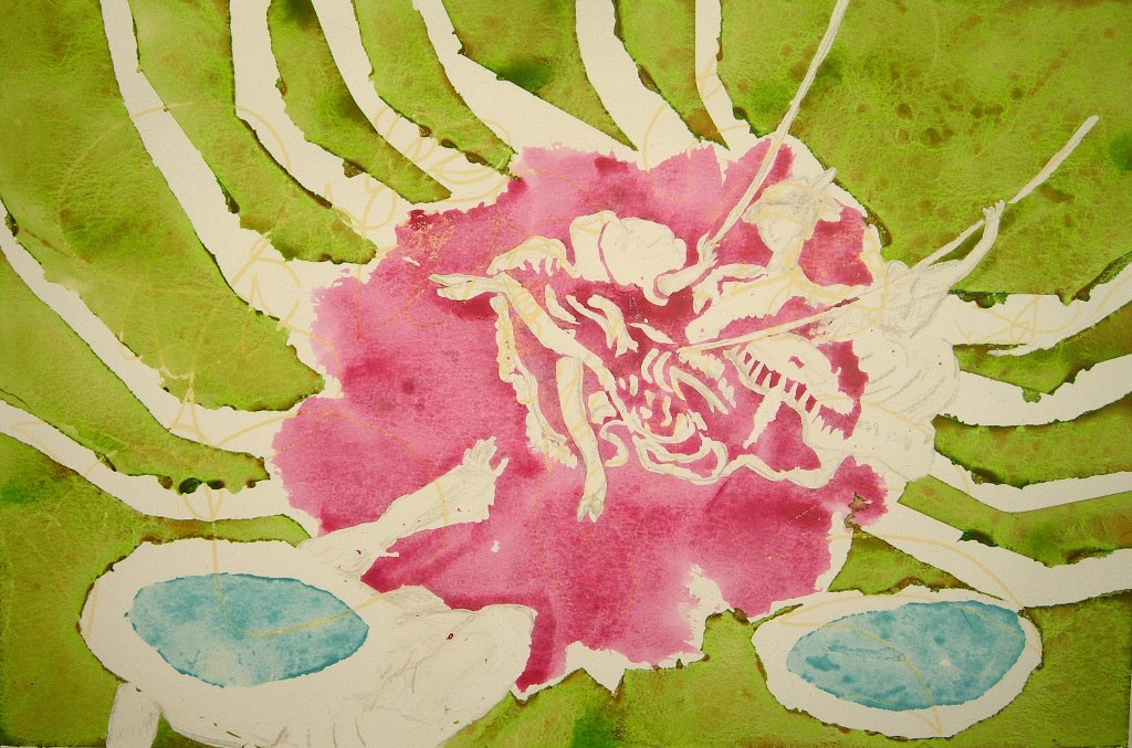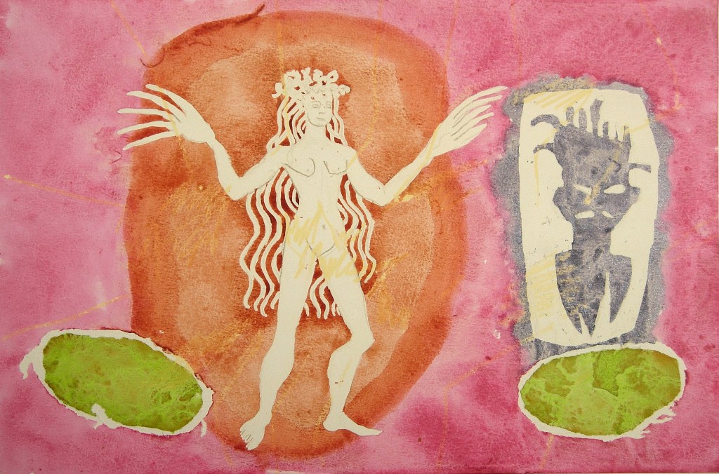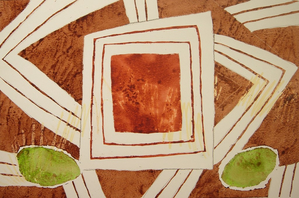 Eve Pix, O-Verts145, rhodonite, pipestone, turquoise, and pencil on paper, 12×18 inches, 2025