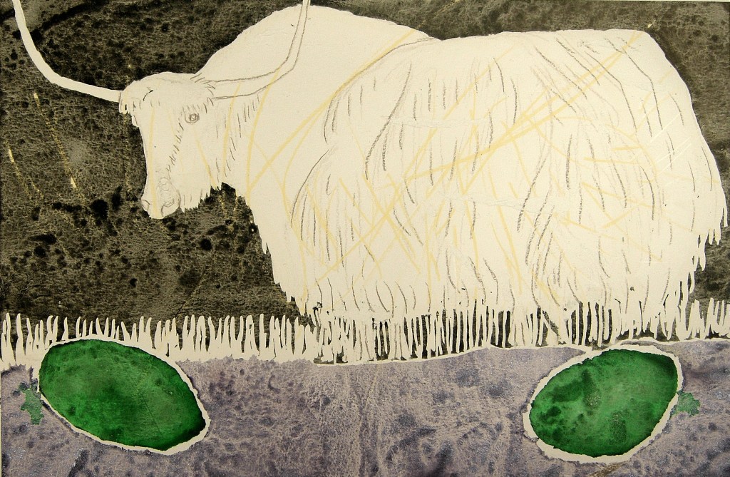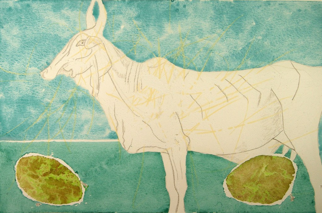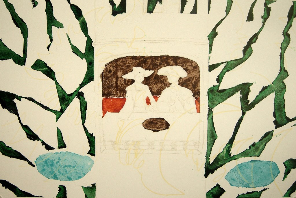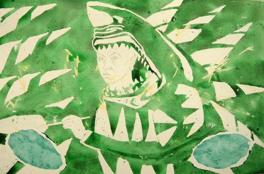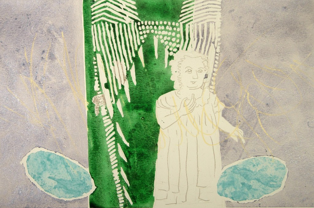 Eve Pix, O-Verts200, bloostone, turquoise, Russian emerald, and pencil on paper, 12×18 inches, 2025