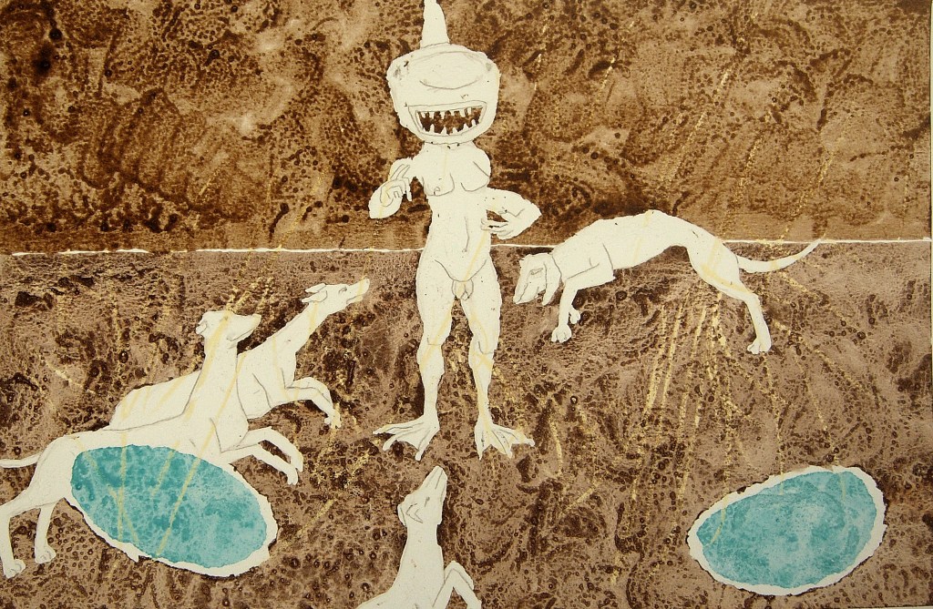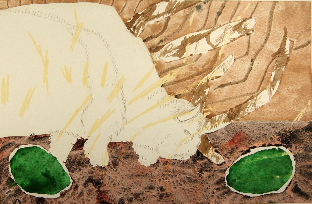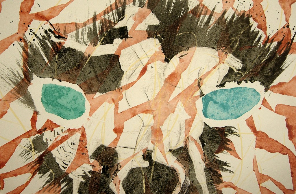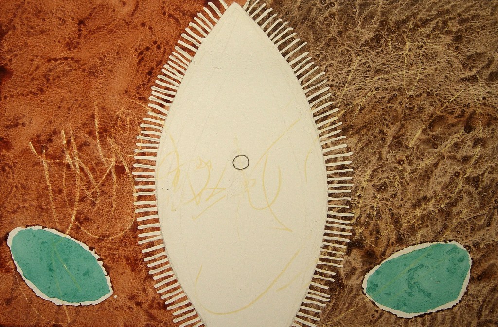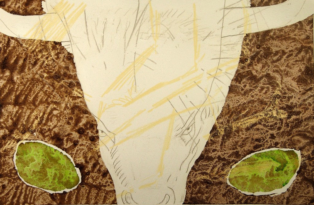 Eve Pix, O-Verts55, bronzite, tiger-eye, turquoise, and pencil on paper, 12×18 inches, 2025