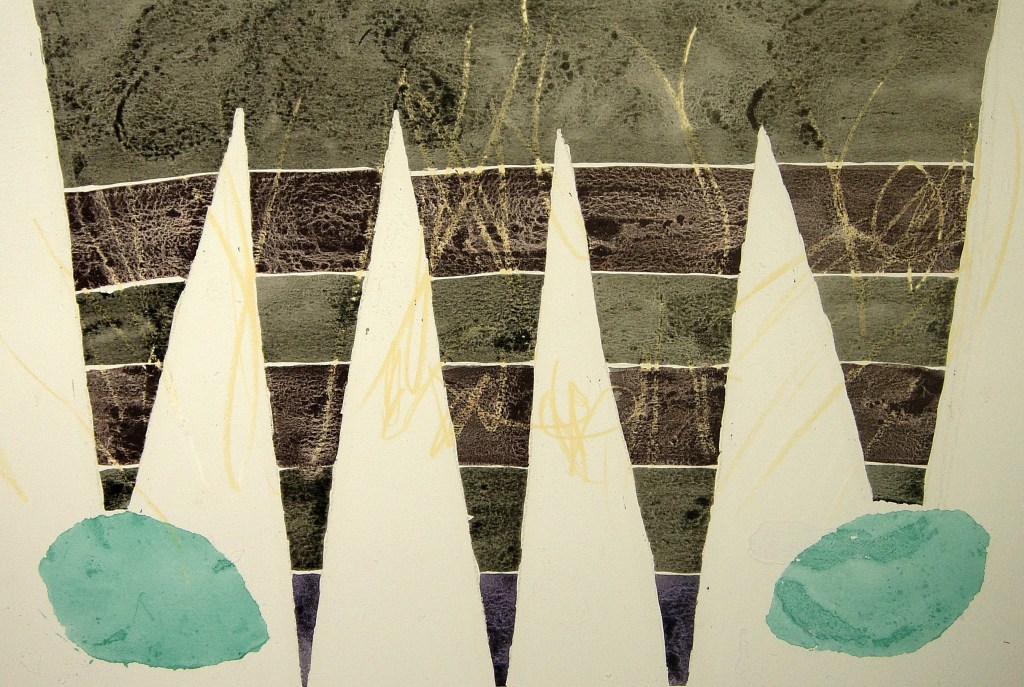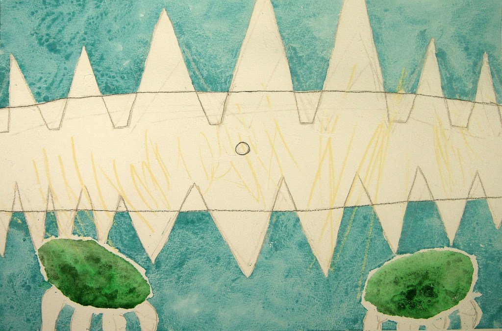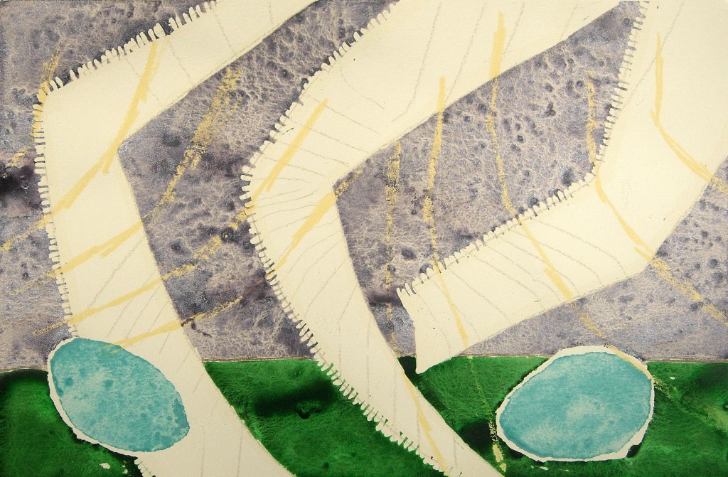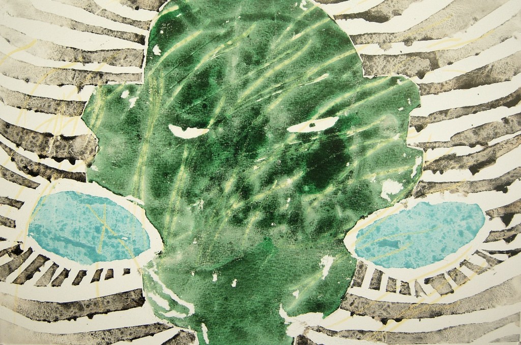 Eve Pix, O-Verts213, turquoise, amazonite, serpentine, and pencil on paper, 12×18 inches, 2025