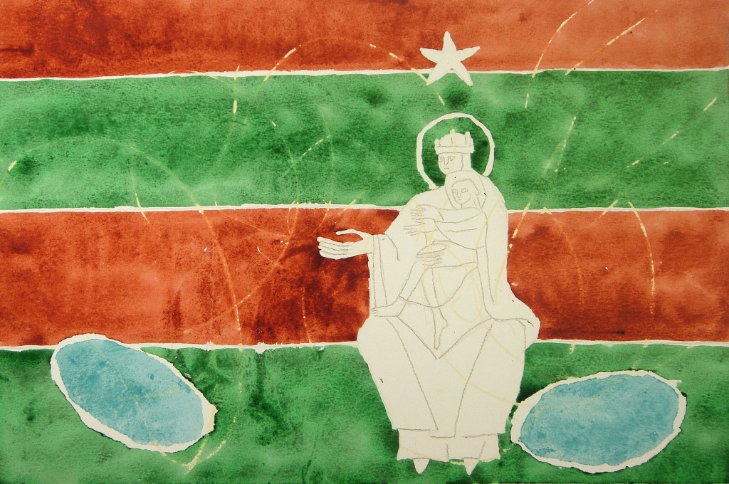 Eve Pix, O-Verts135, garnet, jadeite, amazonite, Russian emerald, and pencil on paper, 12×18 inches, 2025