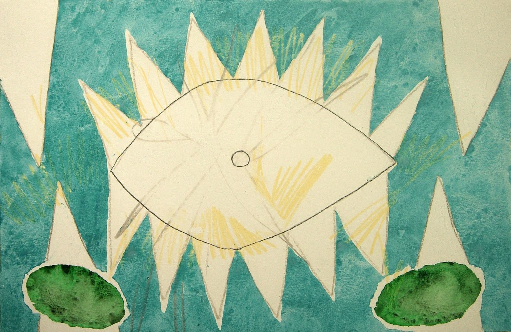 Eve Pix, O-Verts184, tiger-eye, zoisite, turquoise, and pencil on paper, 12×18 inches, 2025