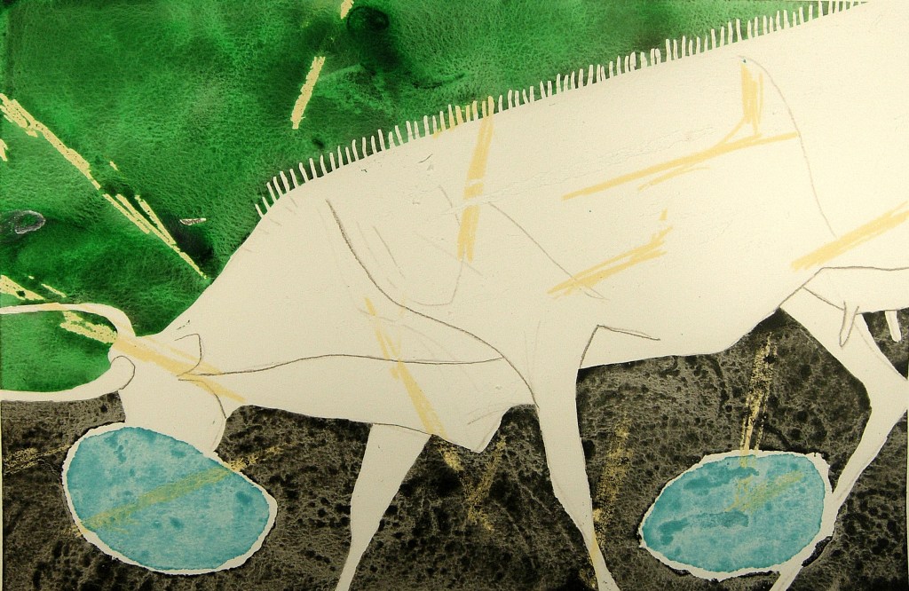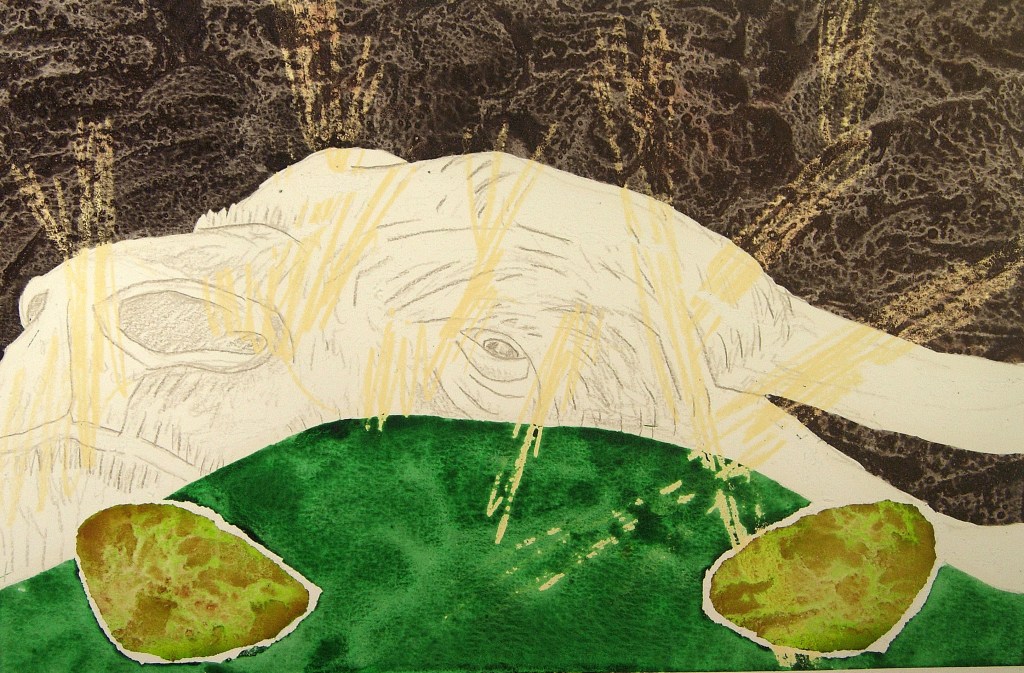 Eve Pix, O-Verts180, Russian emerald, zoisite, turquoise, and pencil on paper, 12×18 inches, 2025