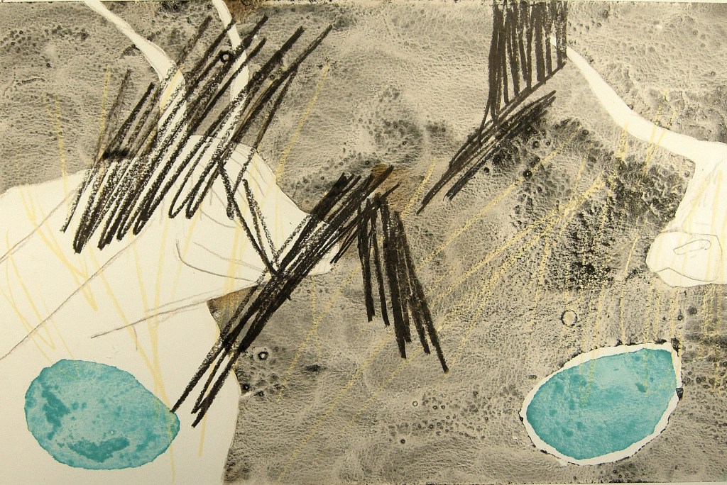 Eve Pix, O-Verts249, hematite, turquoise, and pencil on paper, 12×18 inches, 2025