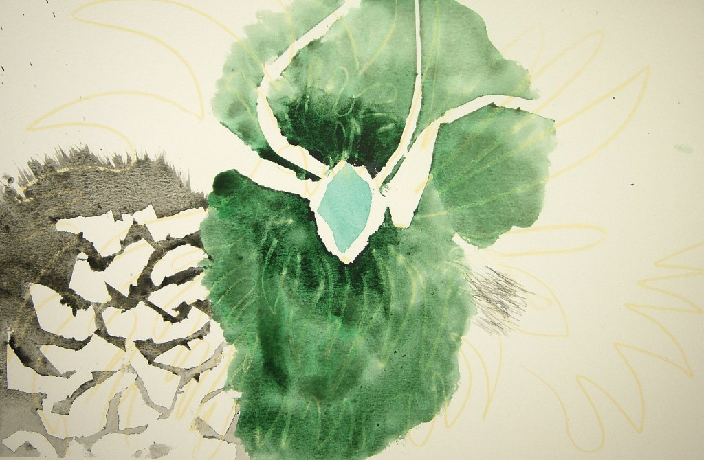 Eve Pix, Tiffany 207, turquoise, serpentine, black tourmaline, and pencil on paper, 12X18 inches, 2024