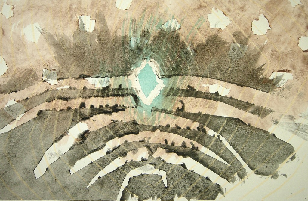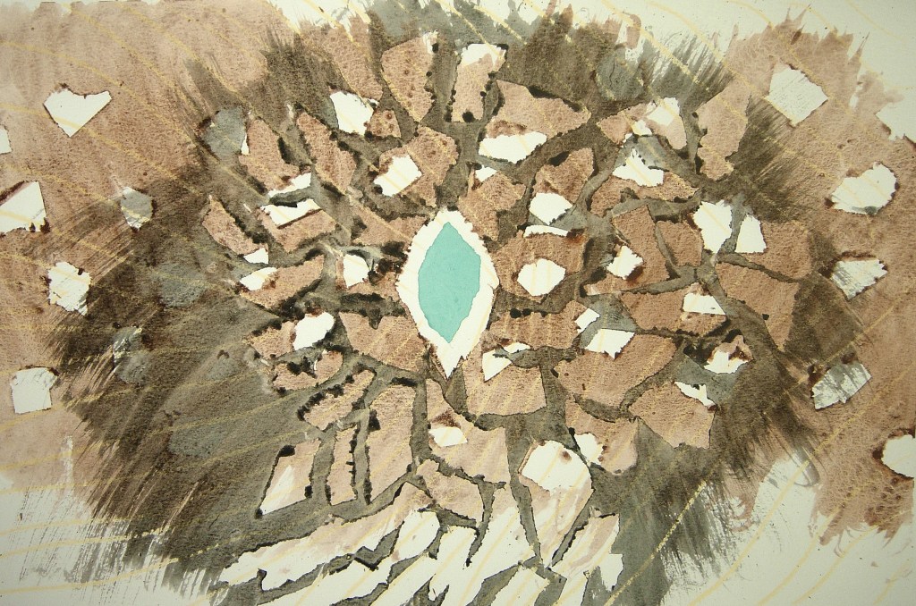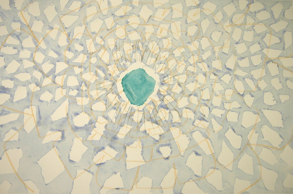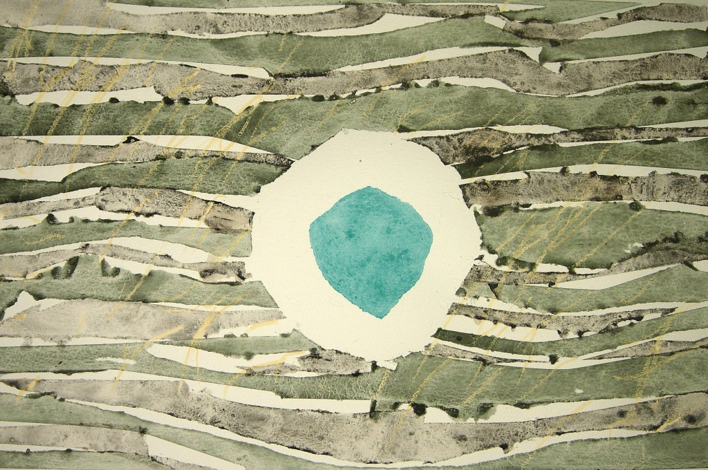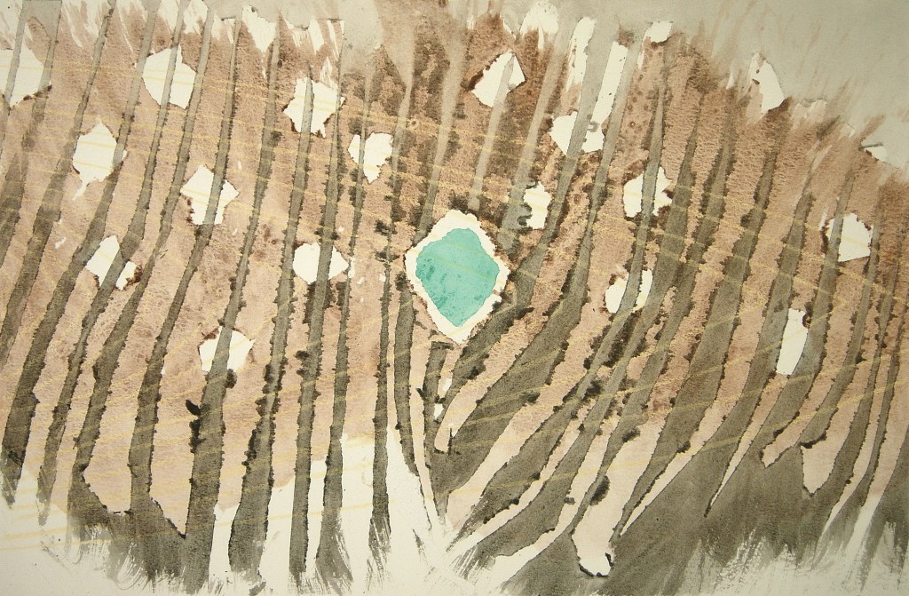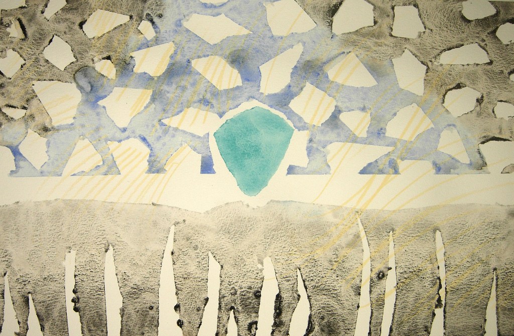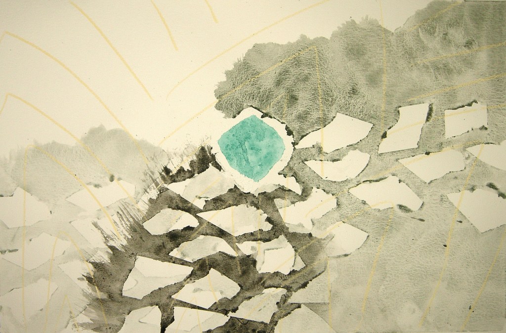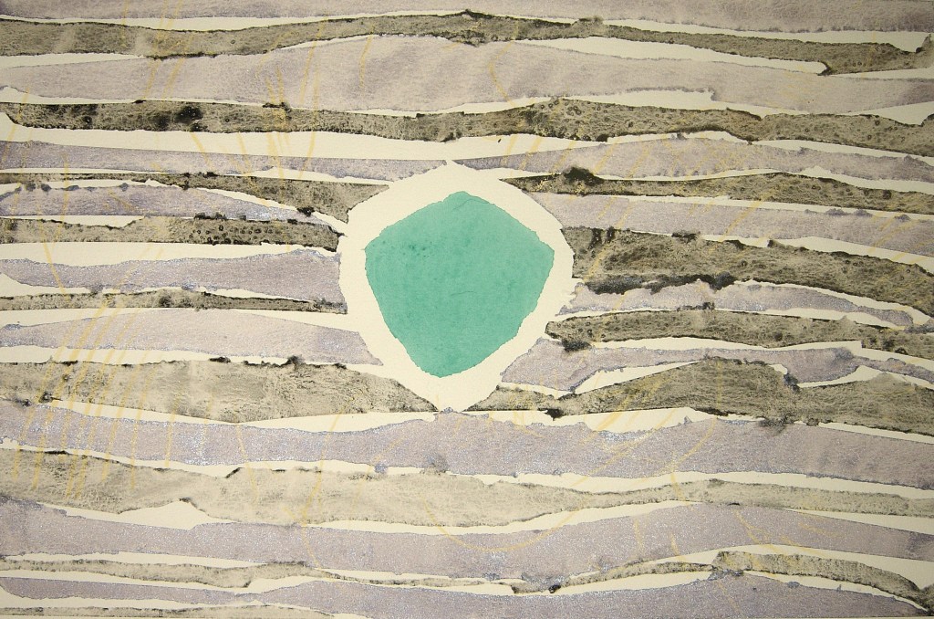 Eve Pix, Tiffany 132, amazonite, pipestone, bauxite, and pencil on paper, 12X18 inches, 2024