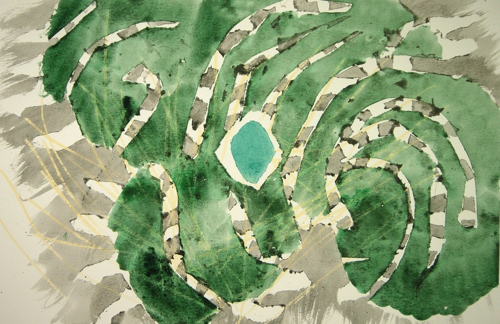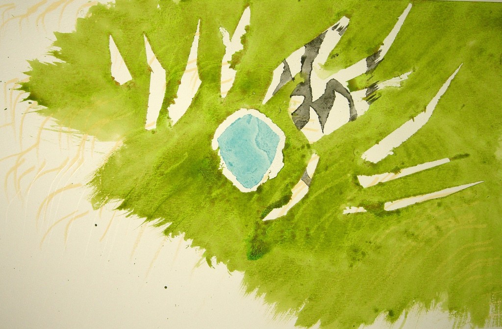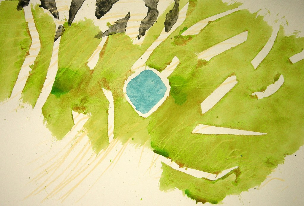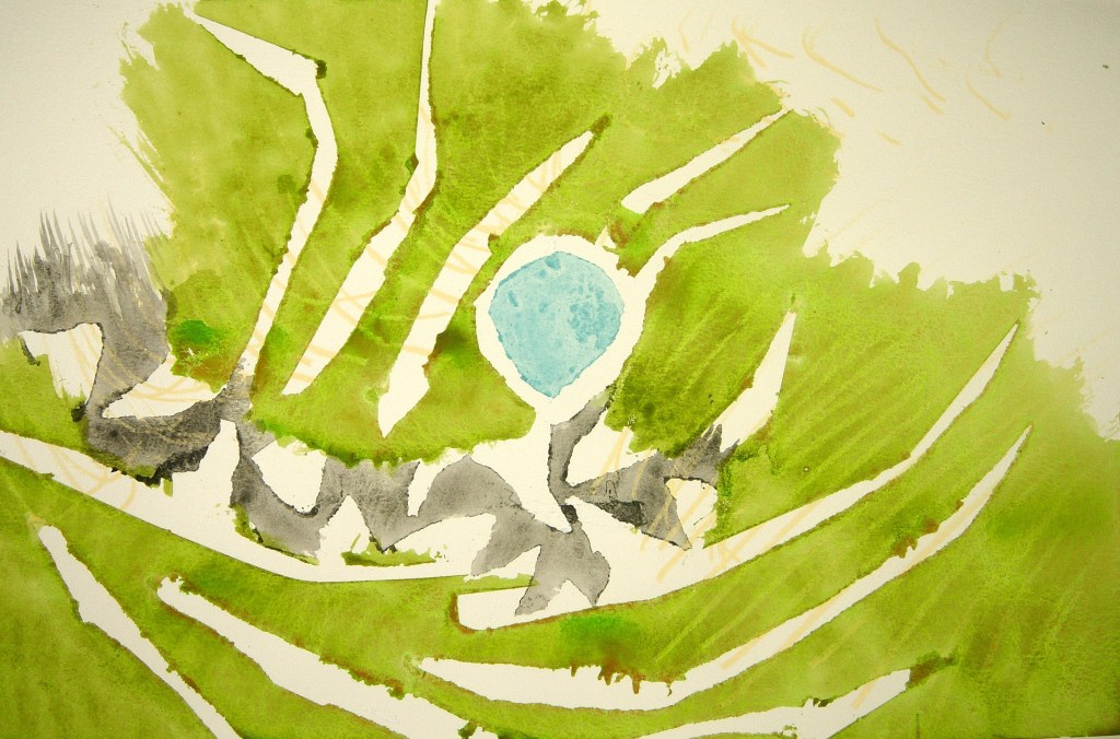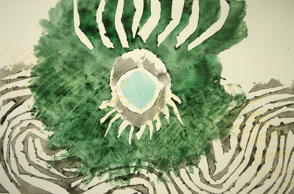 Eve Pix, Tiffany 208, turquoise, serpentine, black tourmaline, and pencil on paper, 12X18 inches, 2024