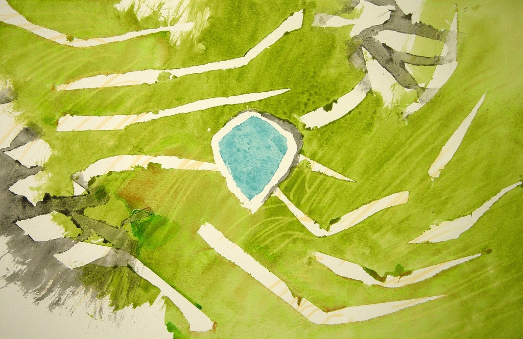 Eve Pix, Tiffany 225, turquoise, serpentine, hematite, and pencil on paper, 12X18 inches, 2024